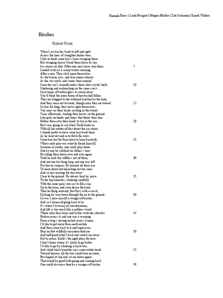 I should prefer to have some boy bend them. The snow is metaphorically compared to broken glass that is swept away. Robert Frosts poem Birches is dense with natural imagery through which the speaker imagines himself moving in various guisesThe supple birch trees are a kind of extended metaphor for life and.